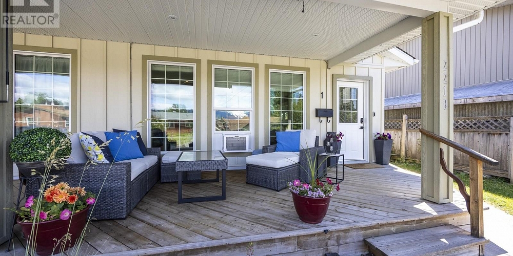 Stunning 2-bedroom, 2-bathroom 1/2 duplex offering just under 1,000 sq ft of thoughtfully designed, one-level living-without strata fees! Only 9 years old and featuring over $70,000 in recent upgrades, this home offers exceptional value and comfort. Enjoy low utility costs thanks to hot water on demand and energy-efficient construction. The gourmet kitchen features quartz counters, SS appliances, ample storage and modern finishes. Step into a spacious mudroom for added convenience. Relax on the charming country-style front porch or entertain in the fully fenced backyard-ideal for pets, gardening, or kids. Plus a large shed for extra storage. This home is as practical as it is inviting. Perfect for downsizing, first home or investment. Don't miss out!